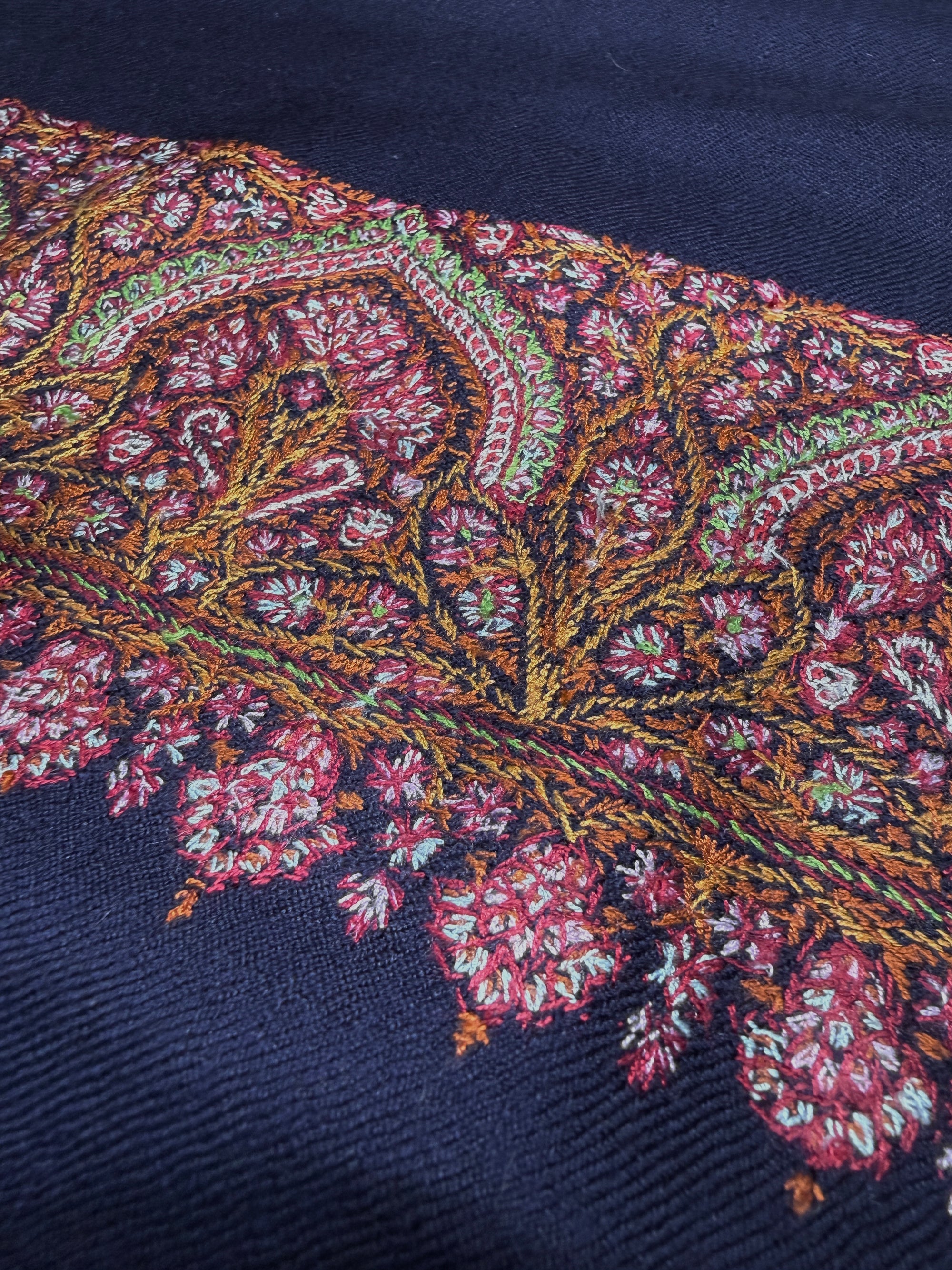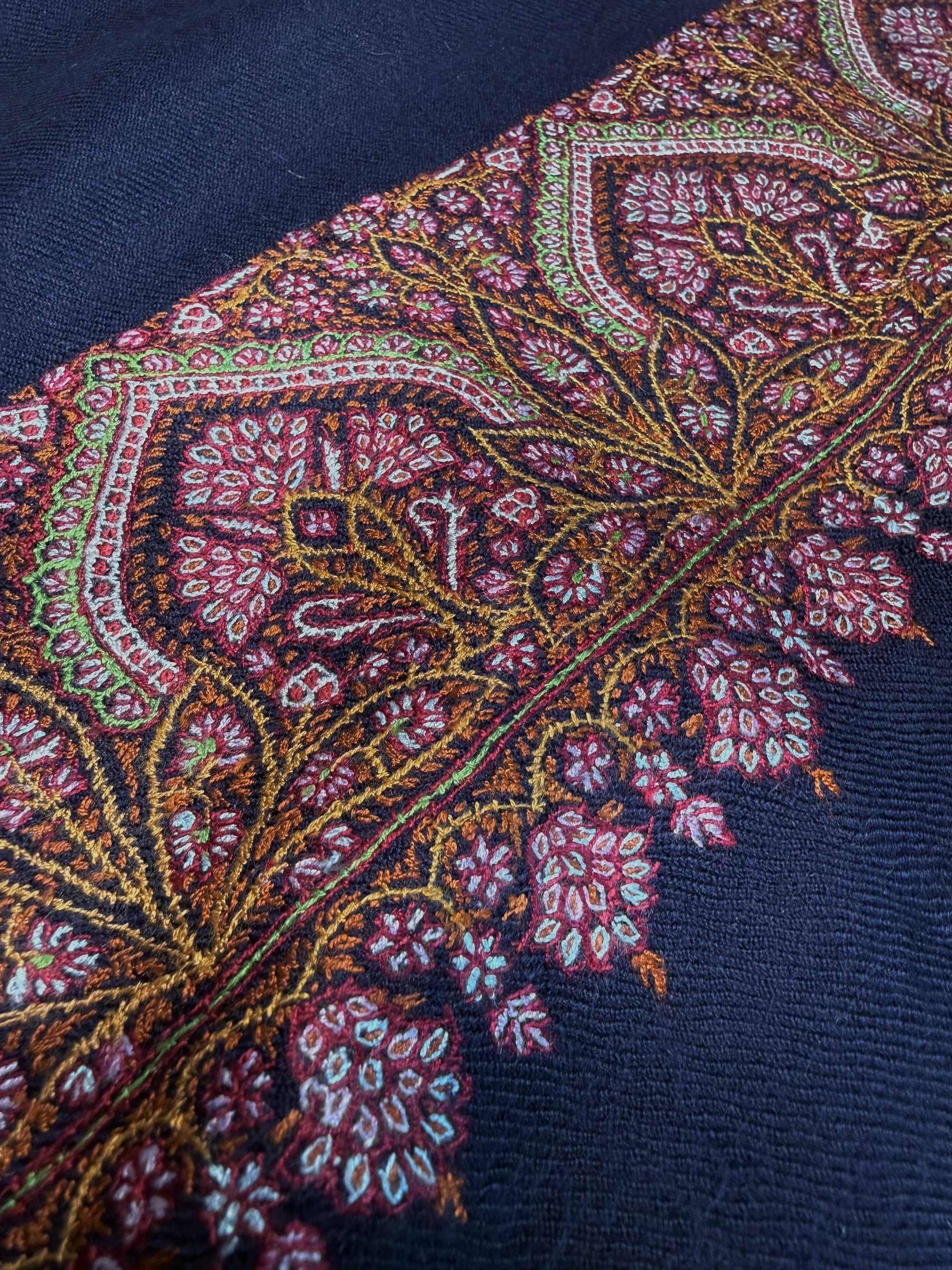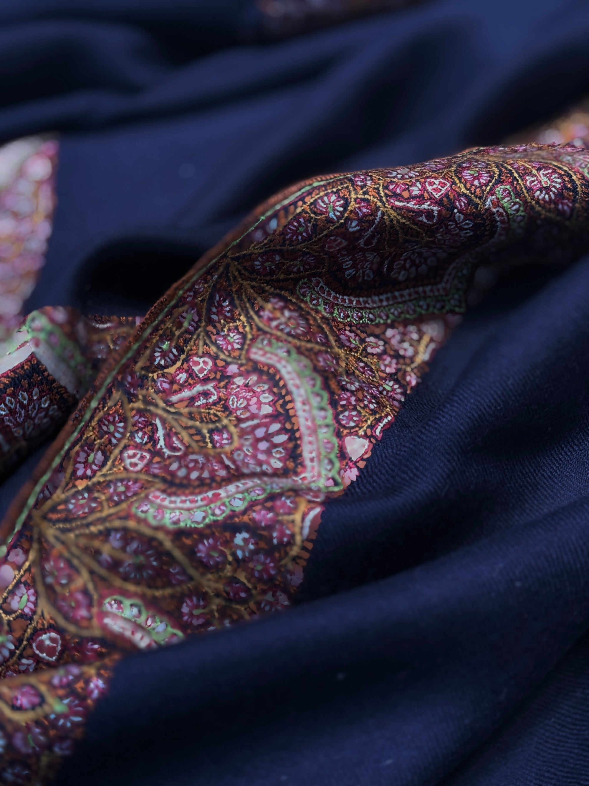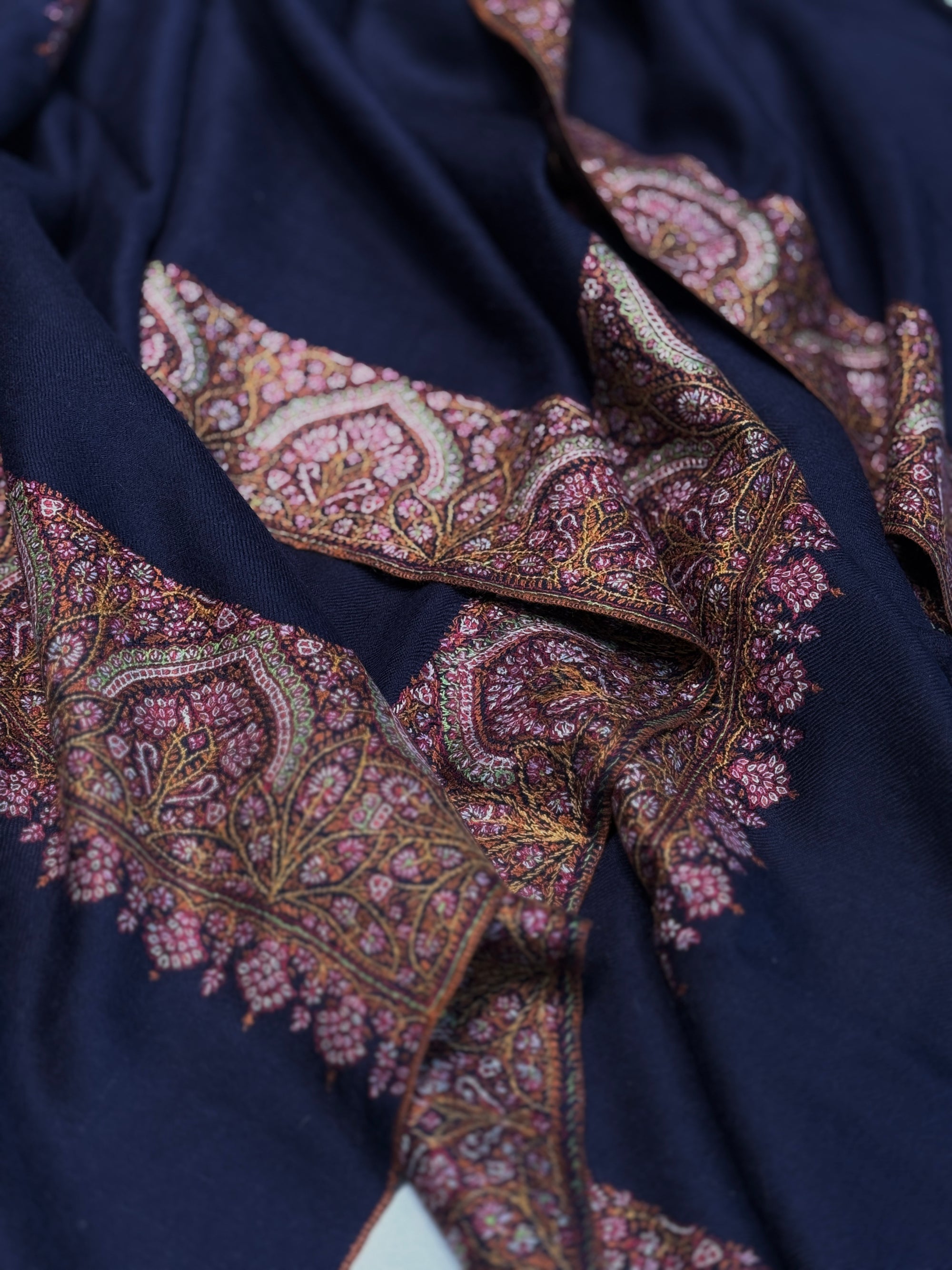Designs are hand pressed on pashmina fabric, using a speical charcoal based ink, then the embroidery artists are provided with colored threads based on desired color palette, and spend hundreds to thousands of hours, stitching the designs. An Amlikar piece with complex design and color palette can take 12-18 months to complete.