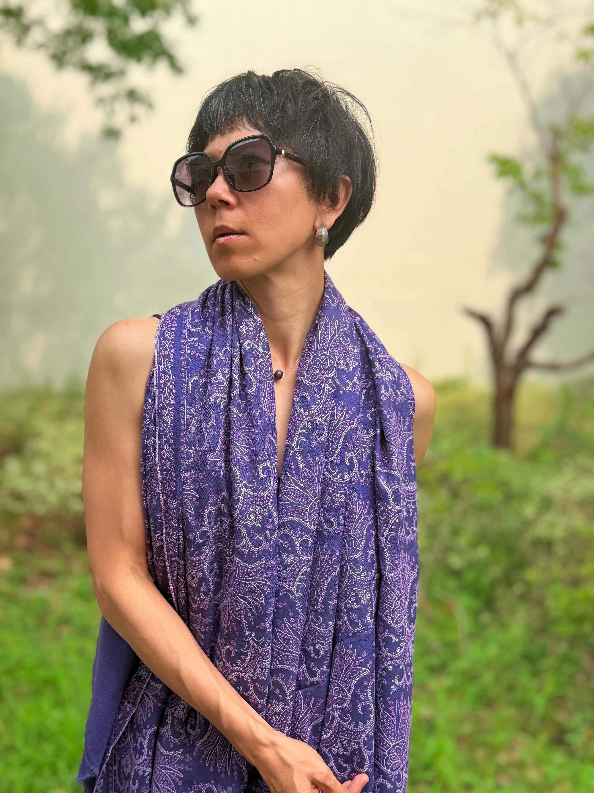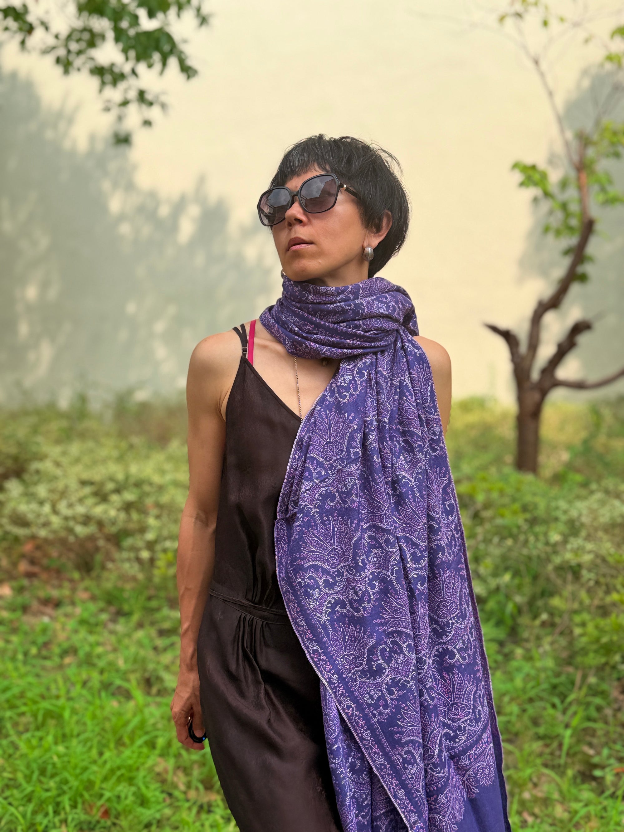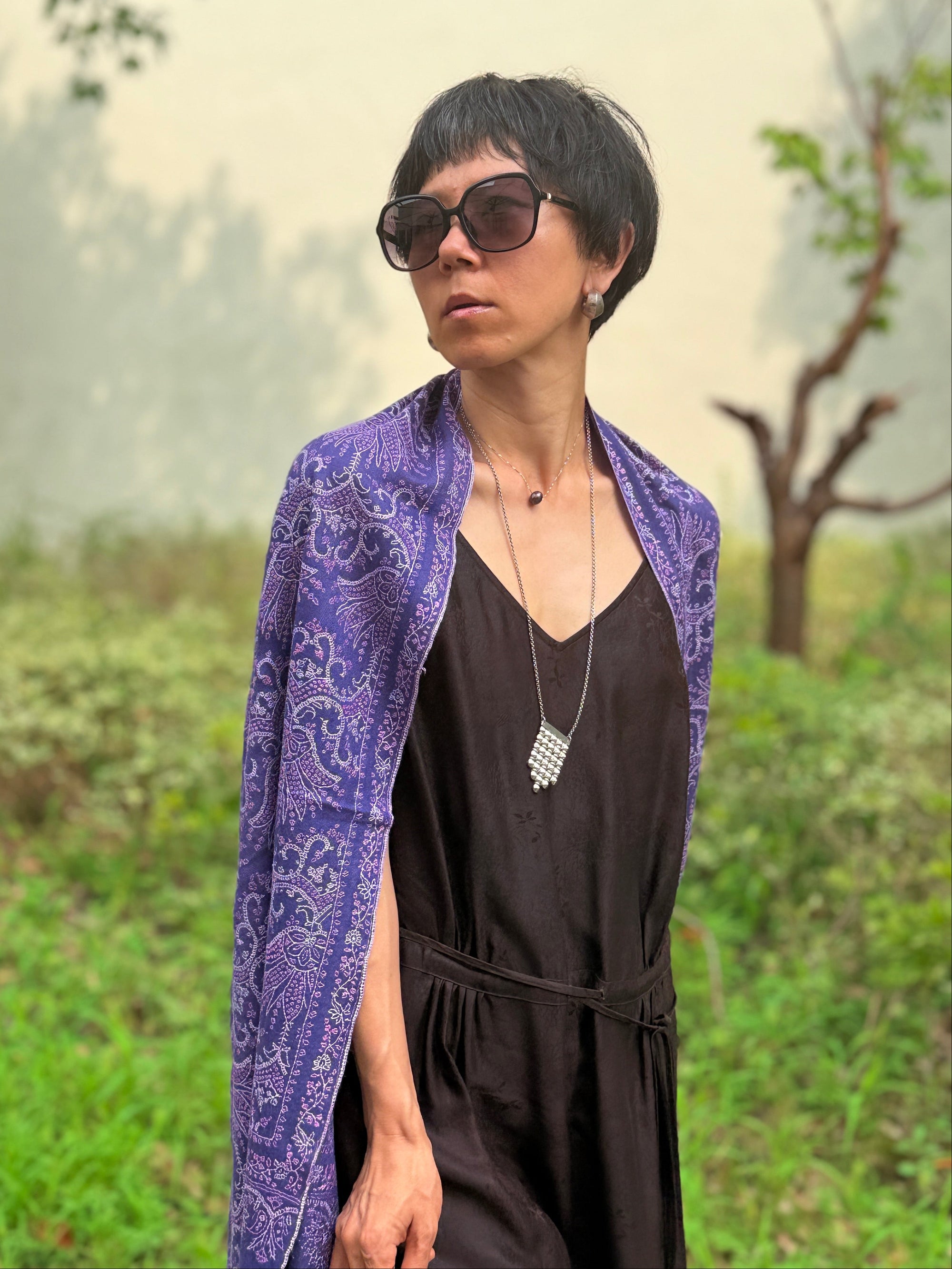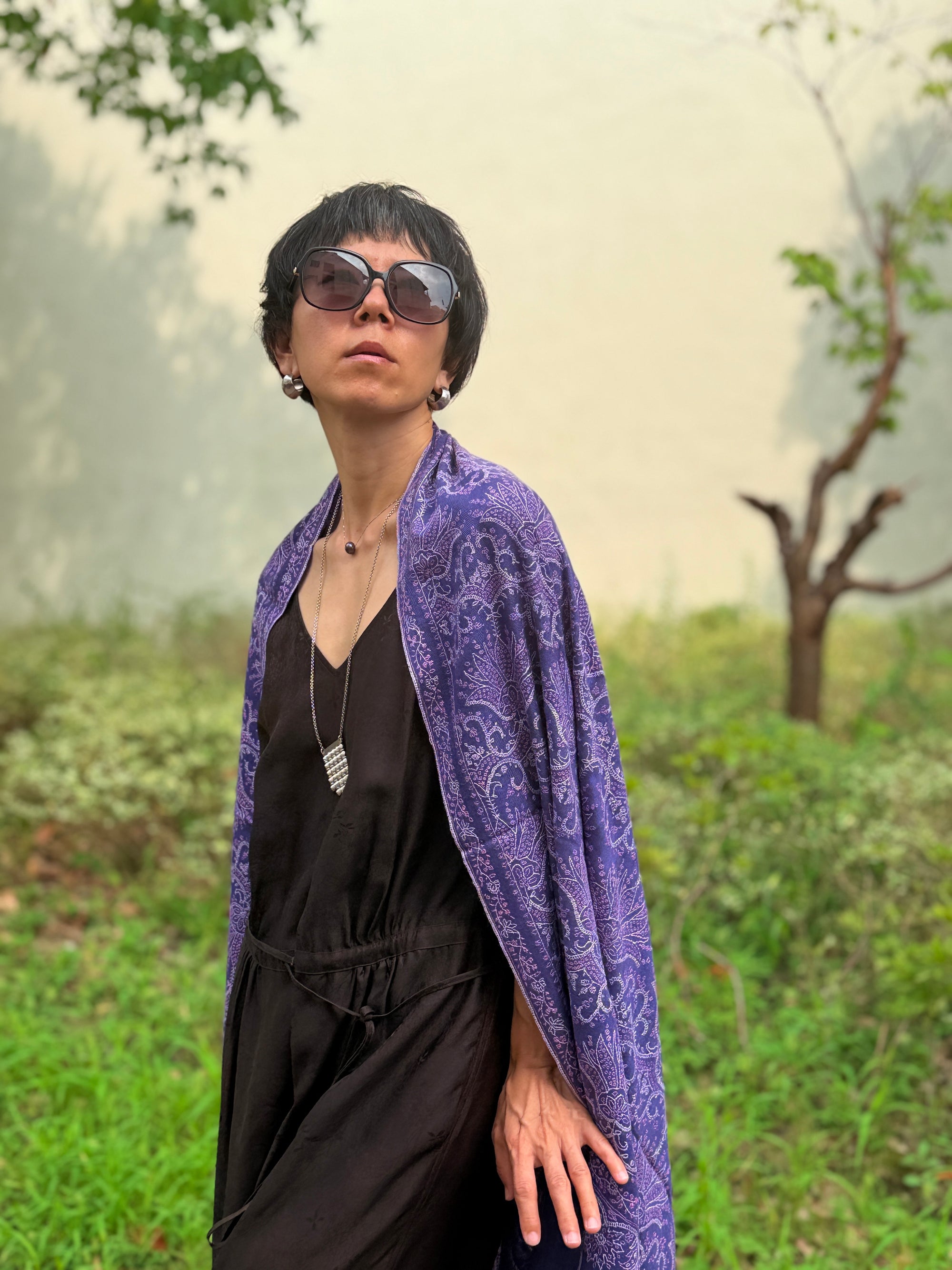 Purple Silk Embroidery Pashmina Shawl with Hashidar Design